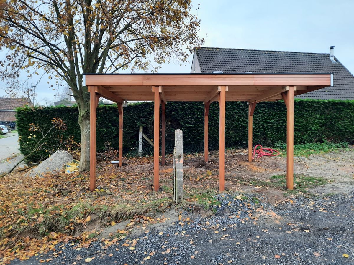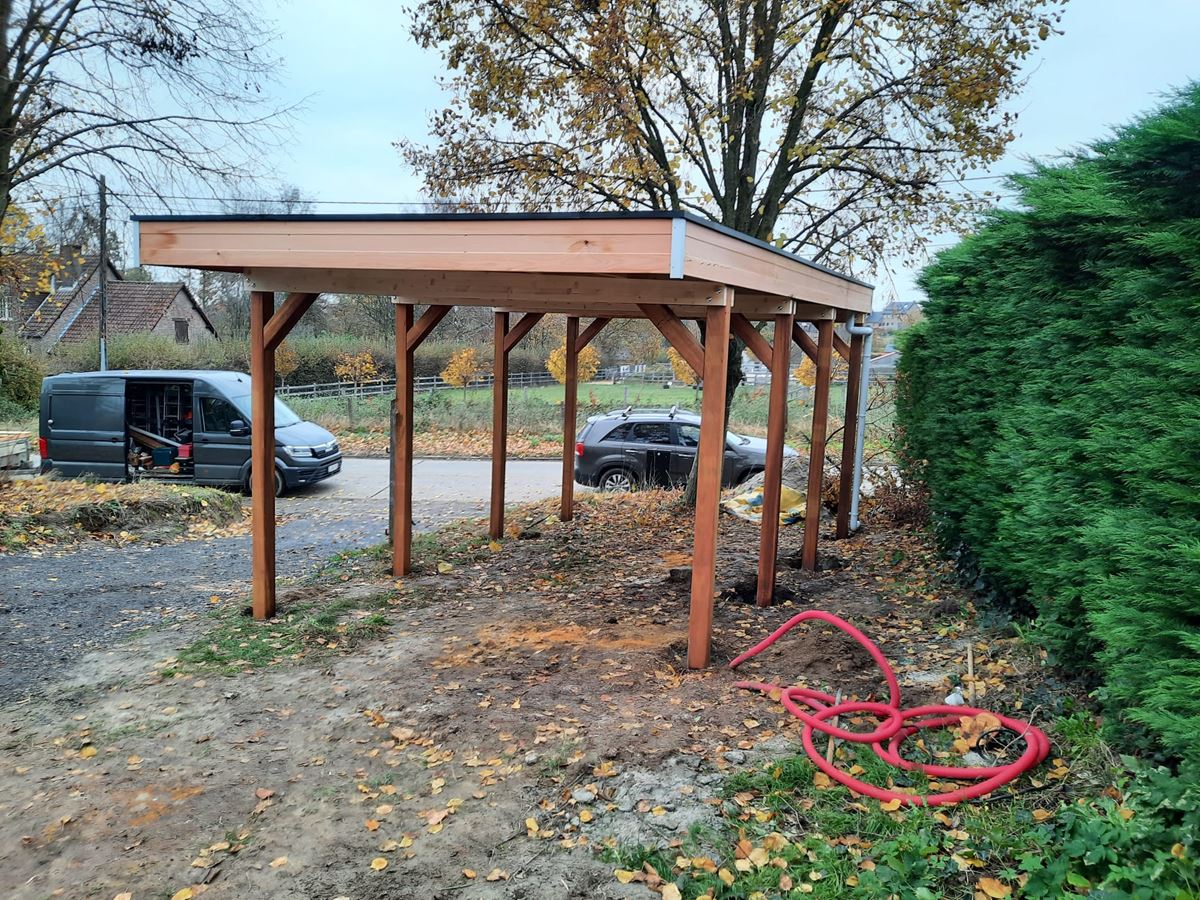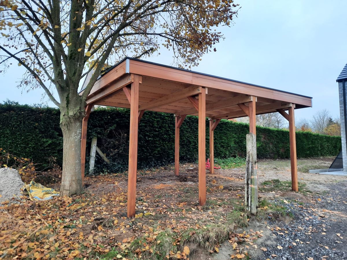 Carport au design épuré et contemporain en bois thermo ayous. Allie durabilité et élégance naturelle, pour une solution pratique et esthétique qui s’intègre parfaitement à votre habitation.