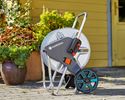 Le CleverRoll M Metal de GARDENA est particulièrement solide et robuste et résiste même aux sollicitations les plus importantes dans le jardin. Il permet un rangement peu encombrant du tuyau d'arrosage et est facile à utiliser. Le tuyau peut être enroulé facilement à l'aide de la manivelle ergonomique en plastique avec des pièces en plastique souple. Grâce à son pied rabattable, ce dévidoir ne peut plus basculer. La forme spéciale et la position visiblement élevée des roues contribuent également à la stabilité du dévidoir. Pour un rangement peu encombrant, le pied peut être replié, la poignée rabattue et la manivelle repliée.
