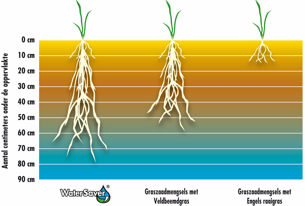 gras water uit diepere lagen. Reguliere grasplantjes wortelen ondieper en zijn enkel in staat water uit de toplaag te halen (bovenste 10 tot 15 cm). Er hoeft niet eens extreme droogte op te treden en het plantje gaat al dood. Het rietzwenkgras in Water Saver® kan tot meer