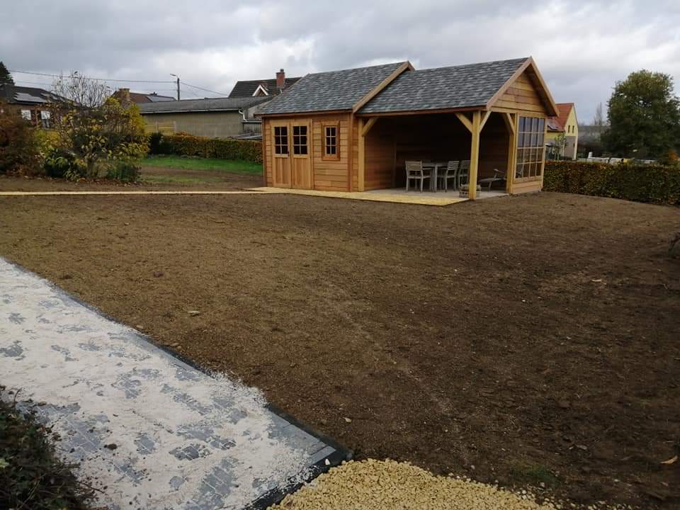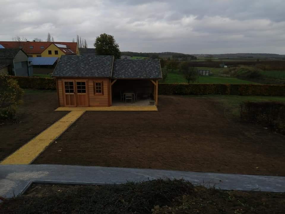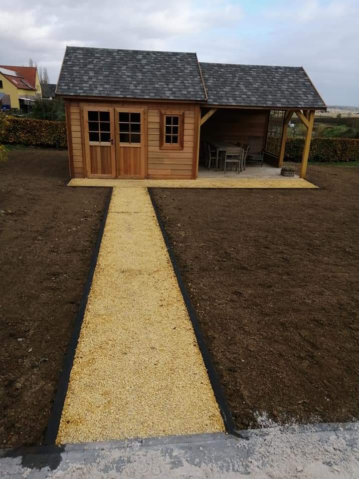 Sfeervol tuinhuis van natuurlijk cederhout, voorzien van een ruime terrasoverkapping. Ideaal voor ontspanning en beschutting, met een warme uitstraling en uitstekende duurzaamheid.