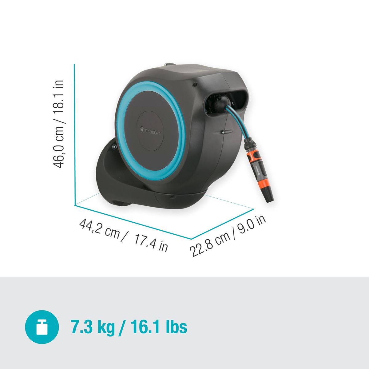 Ready-to-use set with 15 m GARDENA high-quality hose, 11 mm, flexible connection hose, Original GARDENA System Parts and Cleaning Nozzle. Includes wall bracket with screws, wall plugs and assembly aid