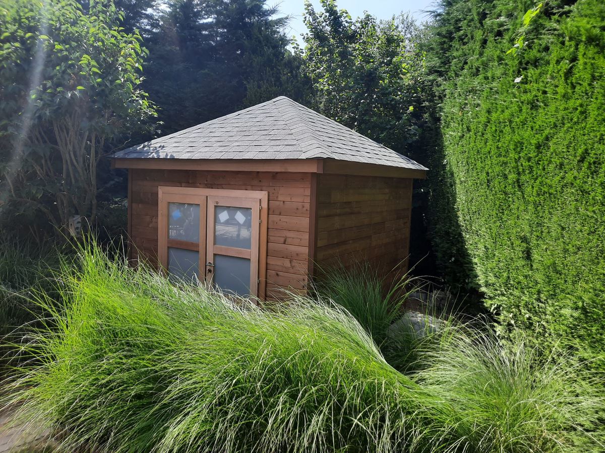 Stijlvol en duurzaam tuinhuis in thermo vurenhout, met een moderne uitstraling en een elegant piramidedak. Ideaal als opbergruimte of knusse buitenplek. Duurzaam, onderhoudsarm en perfect passend in elke tuin.